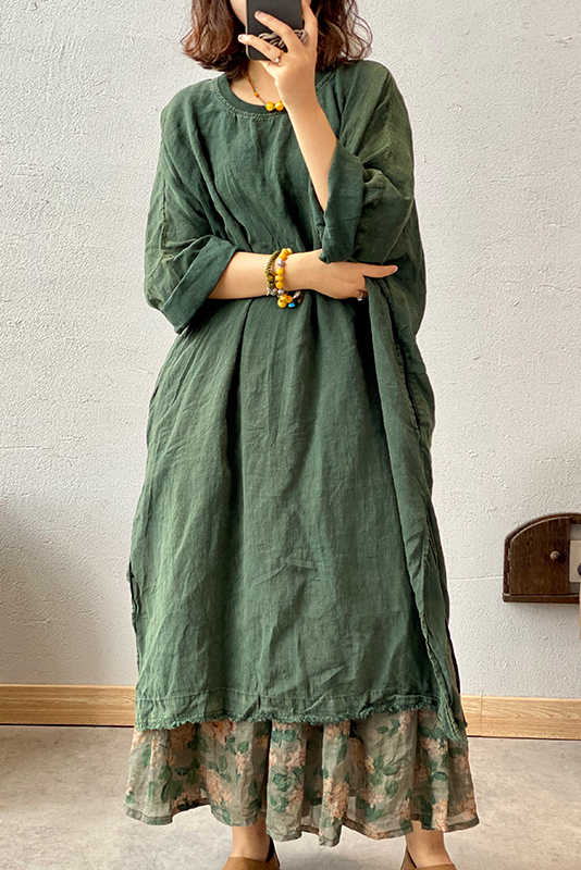 Women's V-neck 3/4-sleeve Casual Loose-fit Cotton-linen Dress