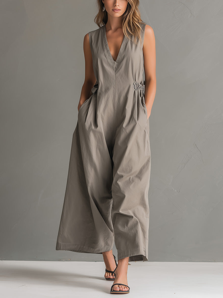 Women's Solid-color V-neck Sleeveless Casual Loose Cotton-linen Wide-leg Jumpsuit