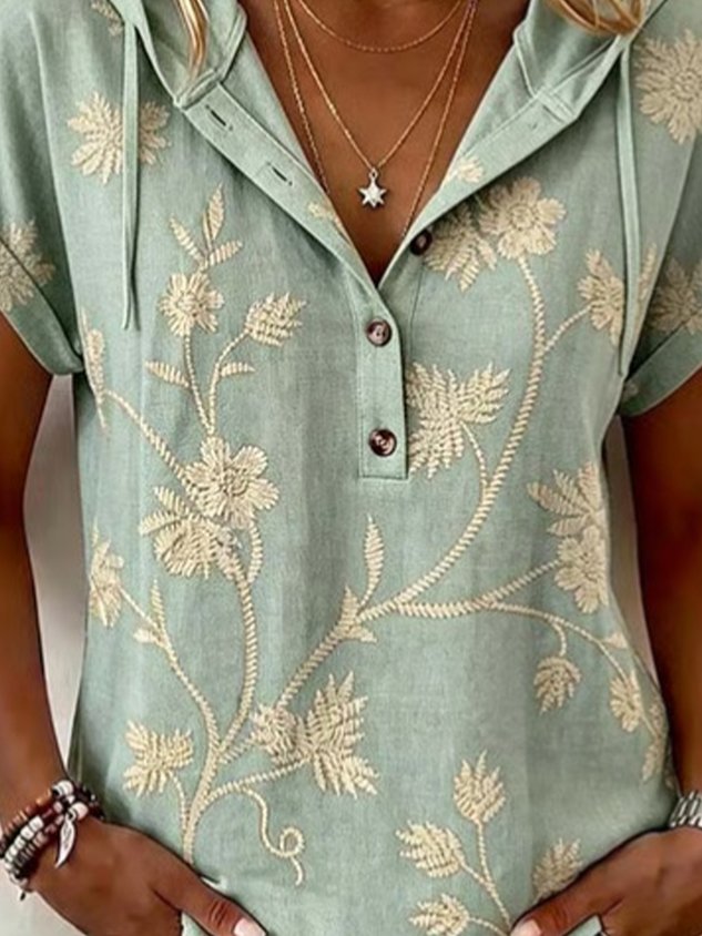 3D Printing Cotton And Linen V Neck Short Sleeve Button Summer Going Out Hoodie Casual Blouse