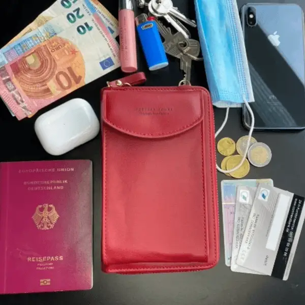 It has room for your cards, cash, glasses, keys, passport and much more. It also has an external pocket with a convenient push-button, to safely store your mobile phone.