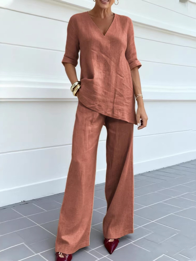 Cotton Linen V Neck Short Sleeve Top With Pants Spring Summer Casual Two-Piece Set