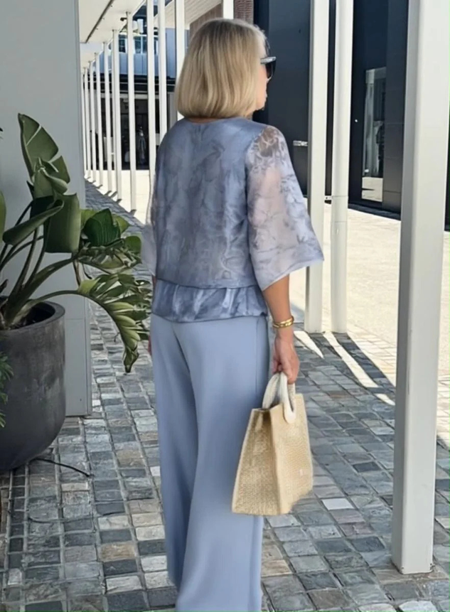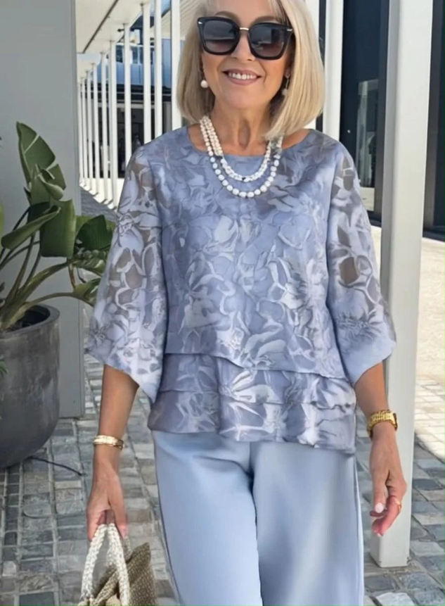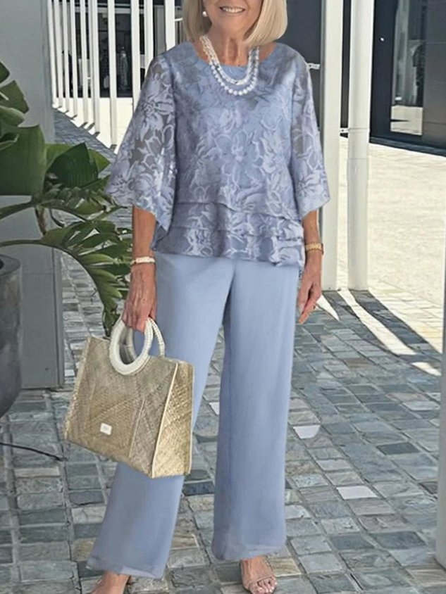 Floral Chiffon Round Neck The Quarter Sleeve Top With Solid Pants Casual Two-Piece Set