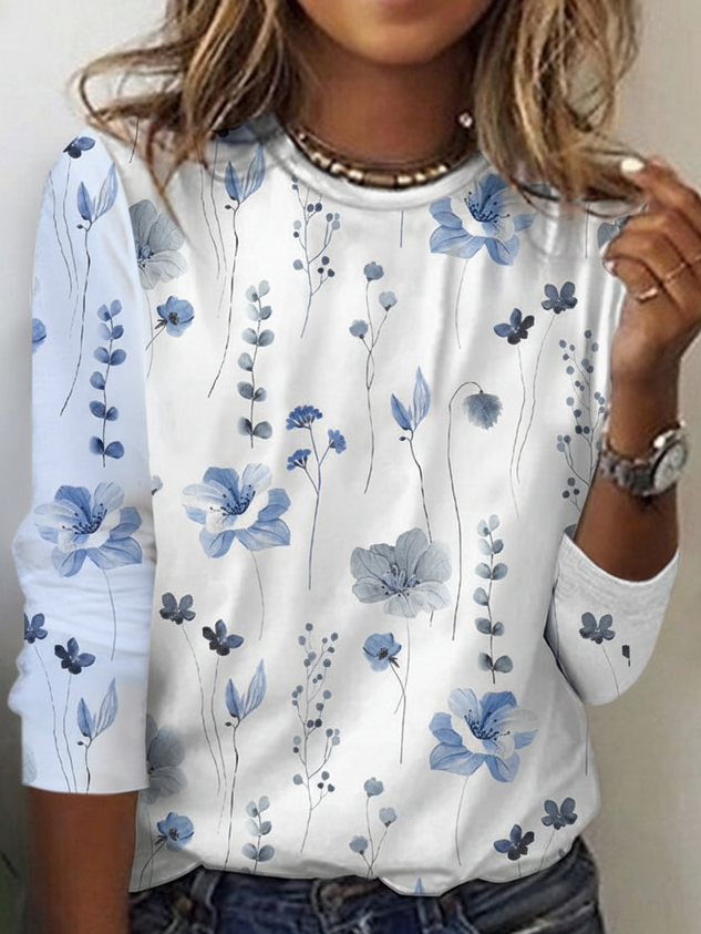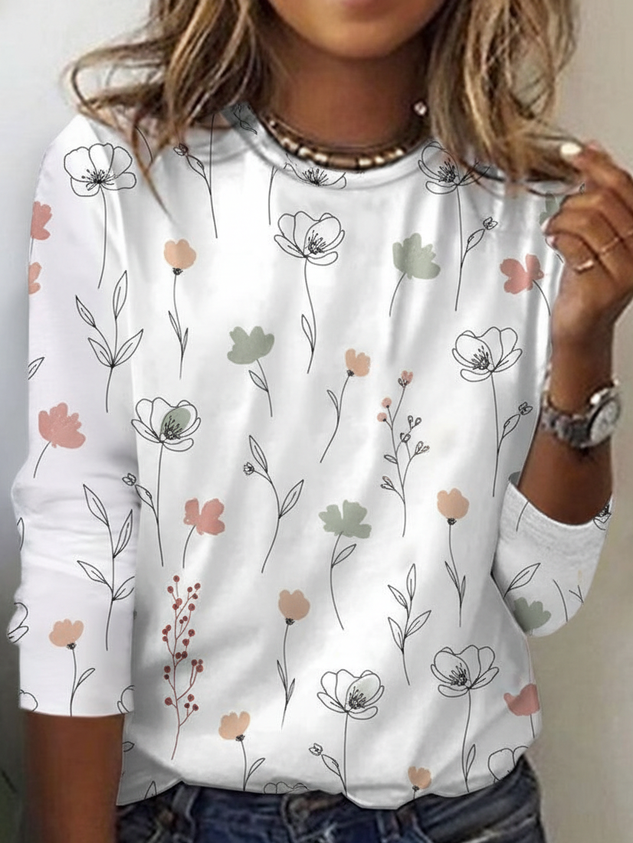 Floral Loose Casual Cotton-Blend T-Shirt