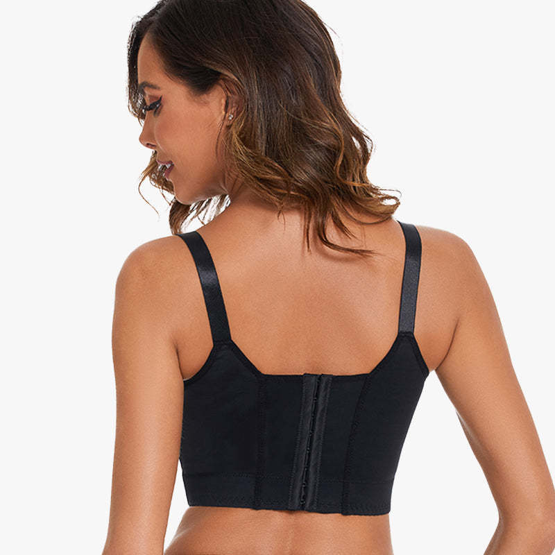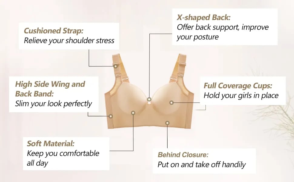 The design of 5D seamed cups, wide side wings, strong cushioned shoulder straps, and U-shape back panel ensures maximum support against sagging while smoothing back bulges and correcting armpit fats for a flattering silhouette.