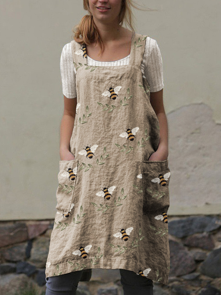 Vintage Bee Floral Faux Embroidery Pattern Cross Back Apron Dress