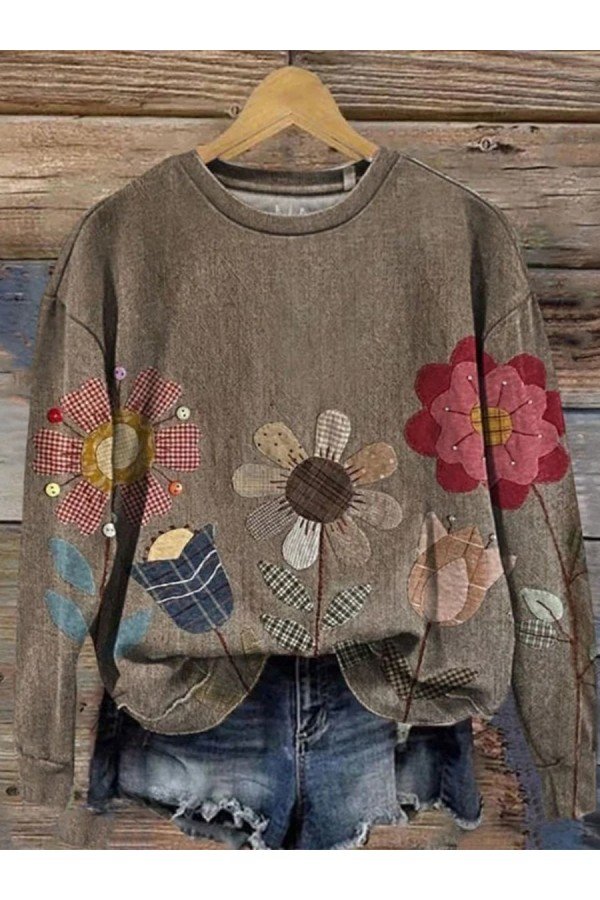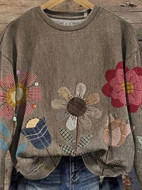 Vintage Floral Print Round Neck Long Sleeve Sweatshirt