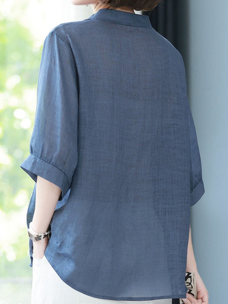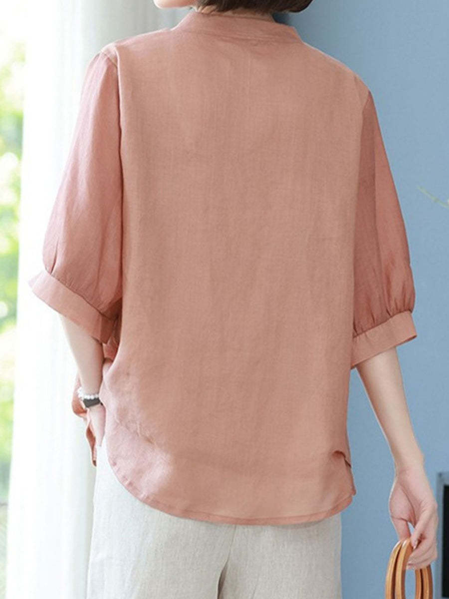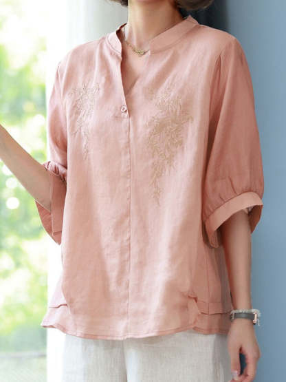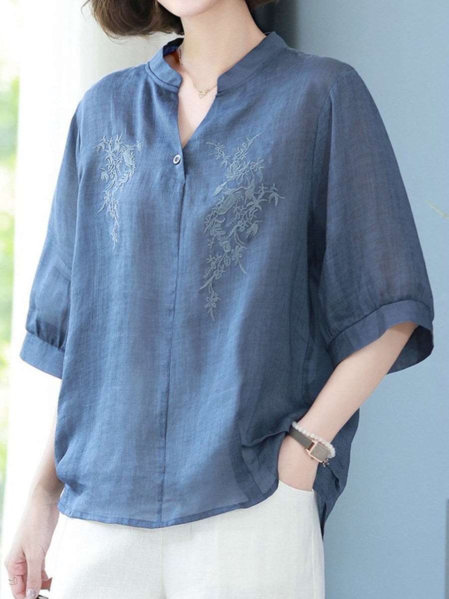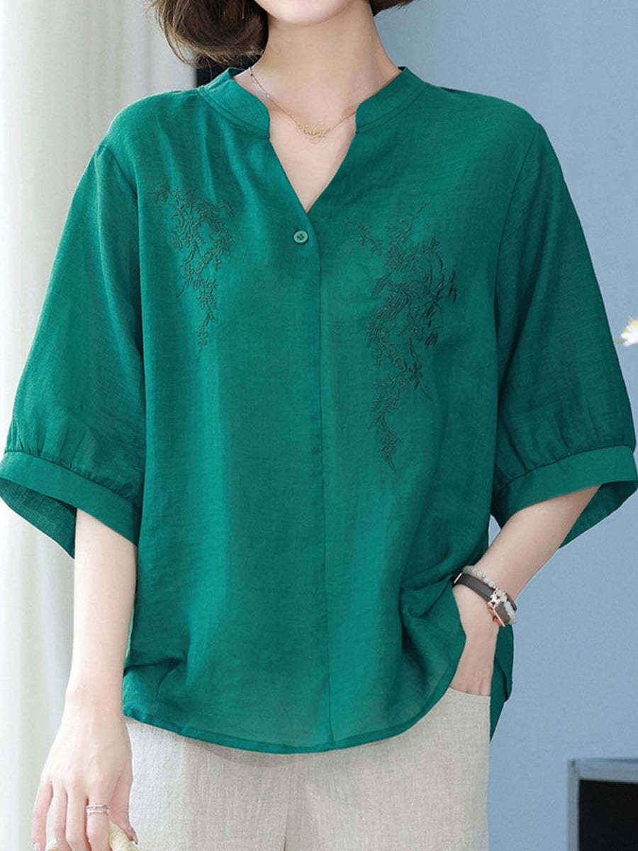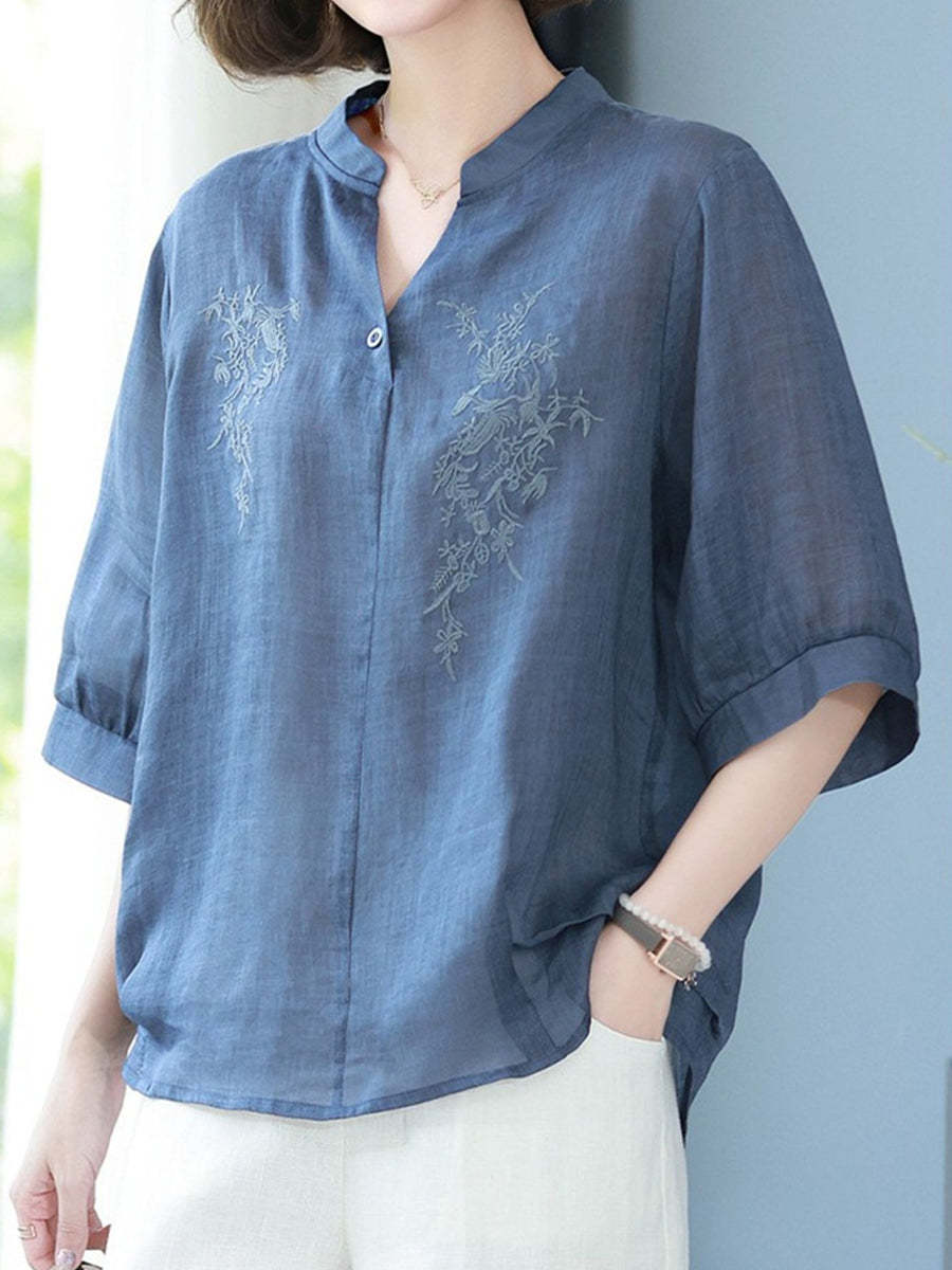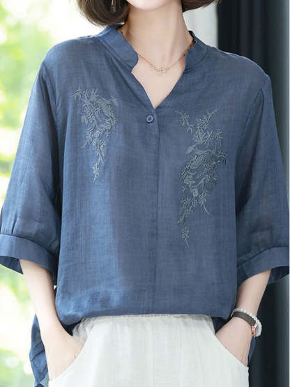 Women's Embroidered Cotton and Linen V-neck Shirt