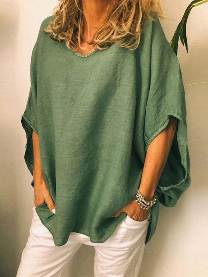Women's V-neck 3/4-sleeve Casual Loose-fit Cotton-linen Dress
