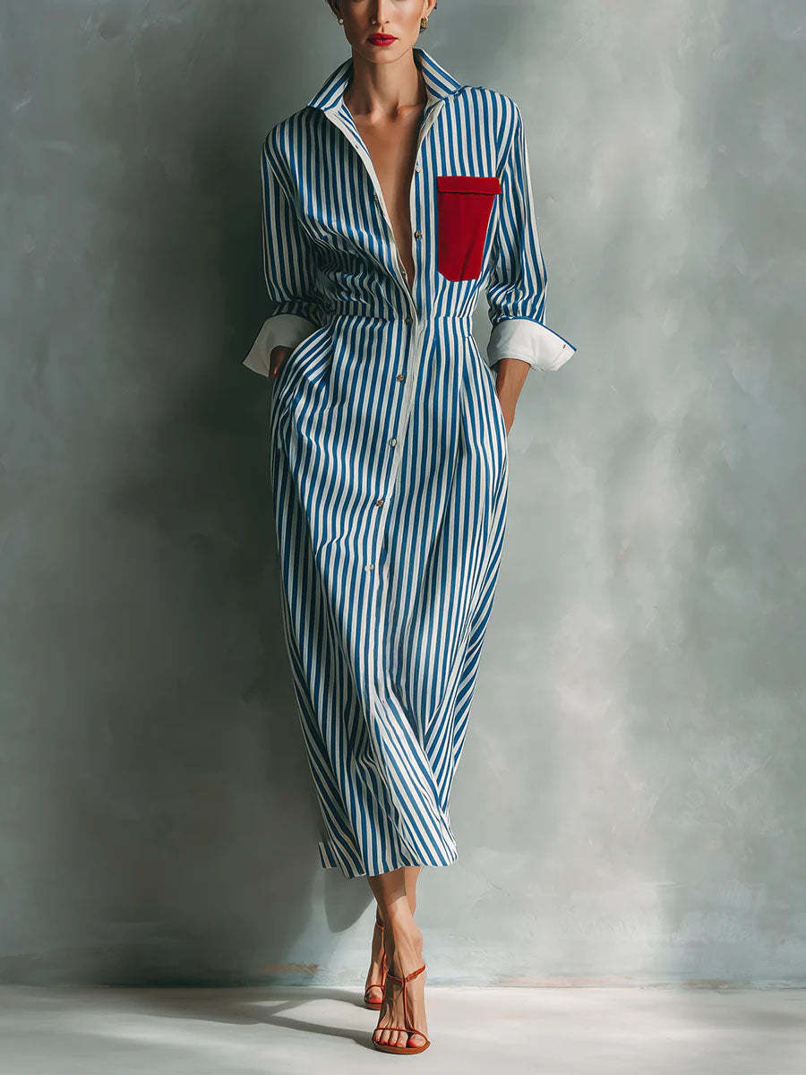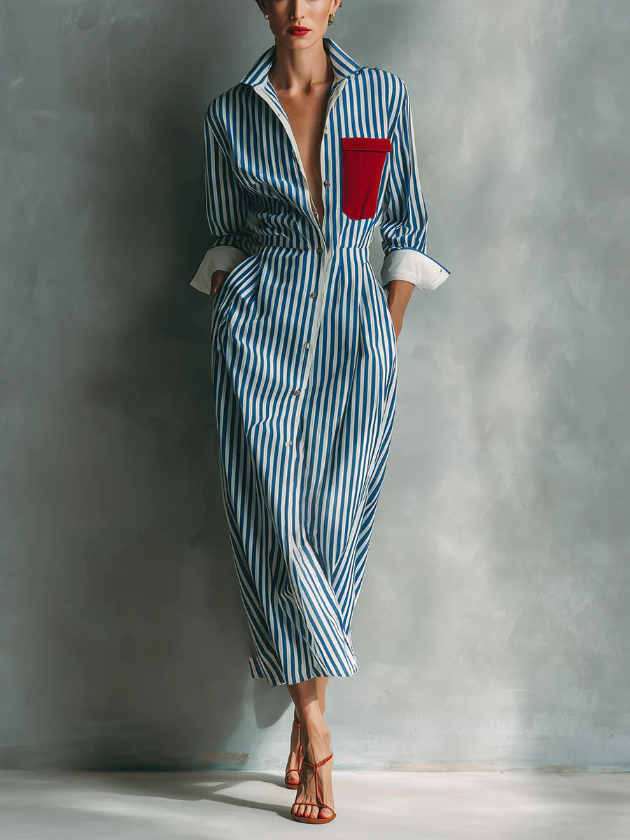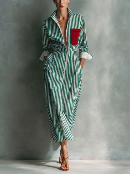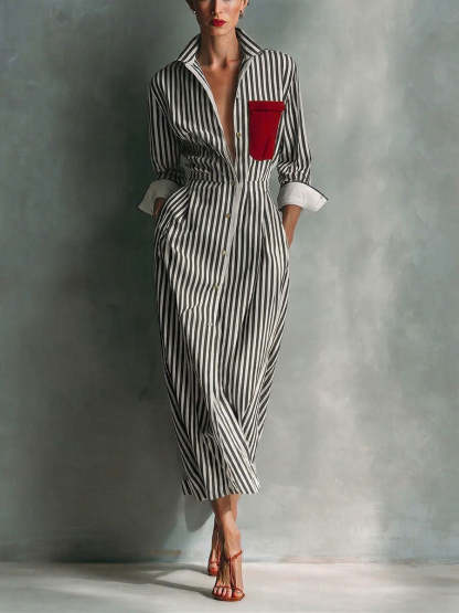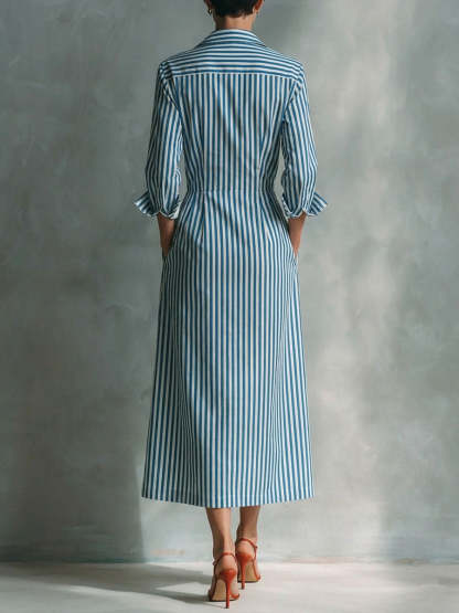 Women's Striped Cotton-linen Shirt-collar Long-sleeve Dress