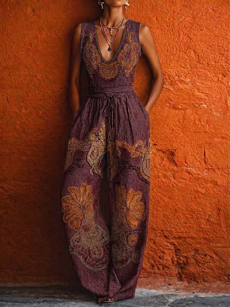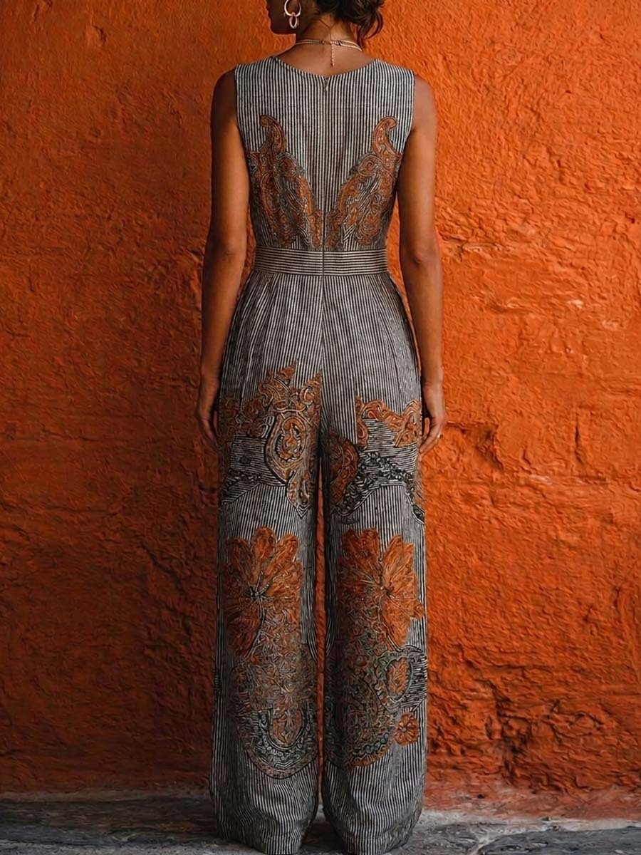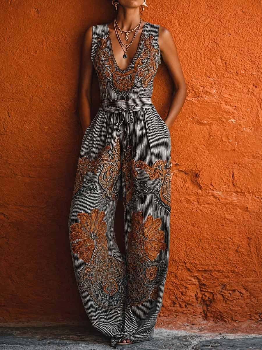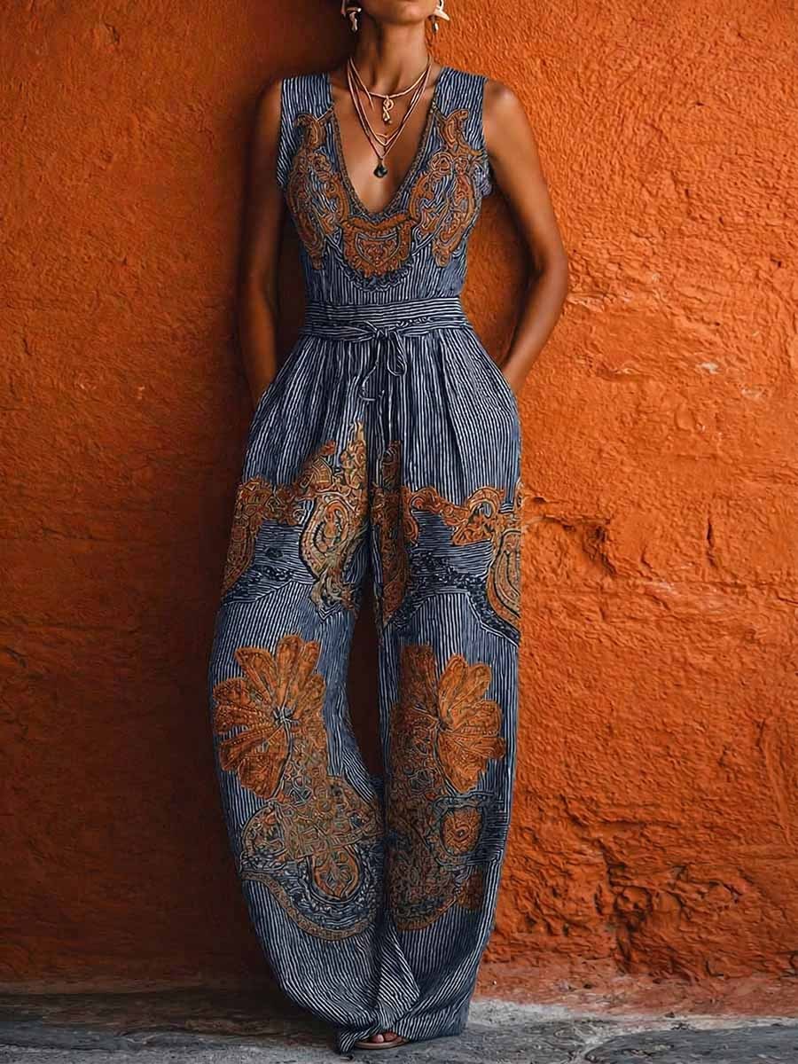 Women's V-neck Sleeveless Casual Loose Retro Striped Cotton-linen Wide-leg Jumpsuit