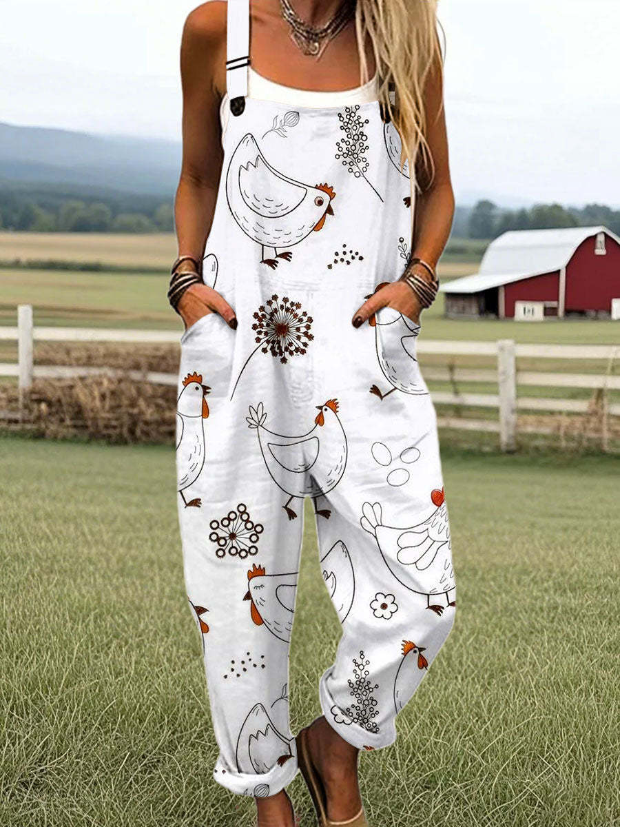 Women's Vintage Farm Animal Chicken Art Print Casual Cotton + Polyester Wide Leg Jumpsuit